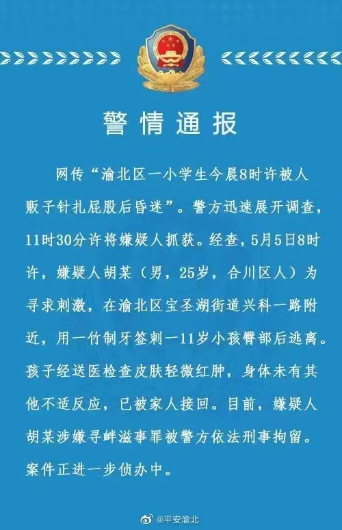 經(jīng)公安機(jī)關(guān)調(diào)查核實(shí):5月5日8時許,嫌疑人胡某(男,25歲,合川區(qū)人)為尋求刺激,在渝北區(qū)寶圣湖街道興科一路附近,用一竹制牙簽刺一11歲小孩臀部后逃離。孩子經(jīng)送醫(yī)檢查皮膚輕微紅腫,身體未有其他不適反應(yīng),已被家人接回。目前,嫌疑人胡某涉嫌尋釁滋事罪被警方依法刑事拘留。案件正進(jìn)一步偵辦中。