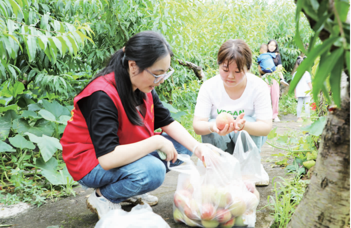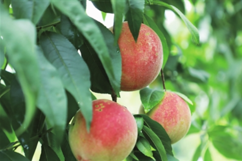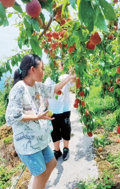 在烏江村蘋(píng)果桃種植專業(yè)合作社種植園內(nèi)果樹(shù)有序排列著,一個(gè)個(gè)粉紅的桃果掛在樹(shù)上,像蘋(píng)果似的,碩大飽滿,果香在園中氤氳開(kāi)來(lái),令人垂涎欲滴。游客穿梭在果園里,摘選、品嘗著蘋(píng)果桃,享受采摘的樂(lè)趣。