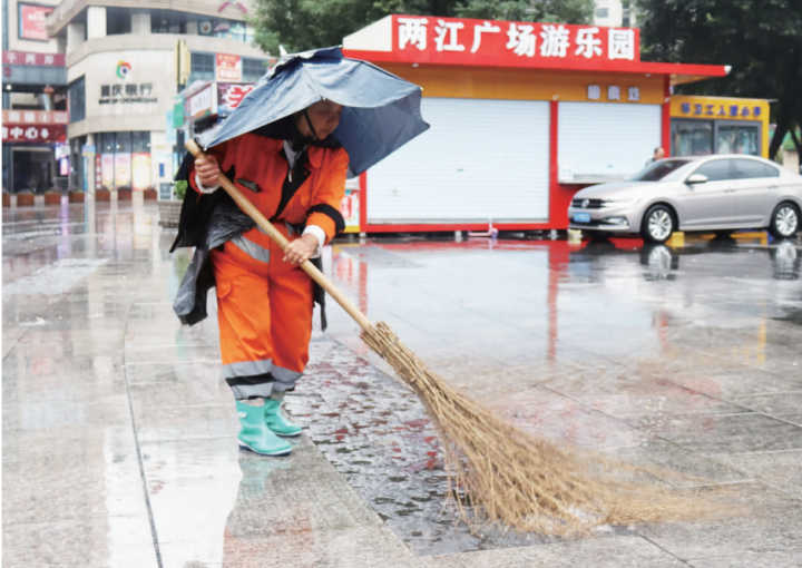 在縣城兩江廣場,早上6時,環(huán)衛(wèi)工人胡澤佑就開始了她一天的工作。雖然天空下著雨,絲毫沒有影響胡澤佑工作的進度,只見她穿好雨衣、戴上遮雨傘、拿起掃把,一一清理廣場上的垃圾。