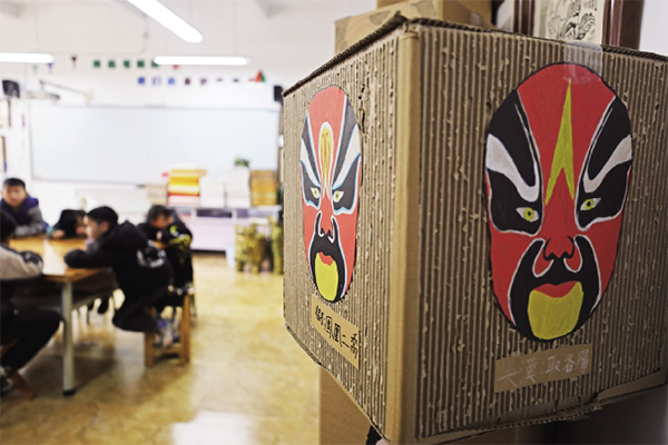 在30多平方米的美術(shù)室里,四周墻壁上都掛滿了孩子們的作品,在廢棄紙箱上繪制的臉譜千姿百態(tài),用樹葉制成的工藝品裝飾畫栩栩如生,用紙箱子、超輕粘土和丙烯顏料做成的仿青銅器古色古香……