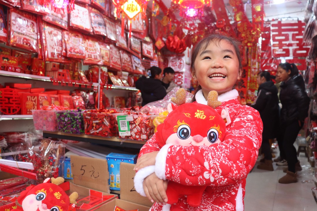 “這些龍形玩偶都很可愛(ài),窗花、小燈籠也好看,過(guò)年了還是要買(mǎi)些飾品把家里布置一下,才有氣氛?!币晃徽谀曦浭袌?chǎng)選購(gòu)商品的市民劉萍萍說(shuō)。