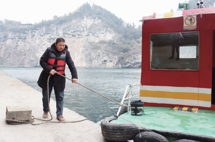 每天早上七點(diǎn)鐘左右,胡永兵到達(dá)馬峰渡口,簡(jiǎn)單收拾一下,檢查渡船情況后,開啟他一天的擺渡人生活。2月29日,記者見到胡永兵時(shí),他正在引導(dǎo)村民有序上船,幫助他們穿好救生衣。