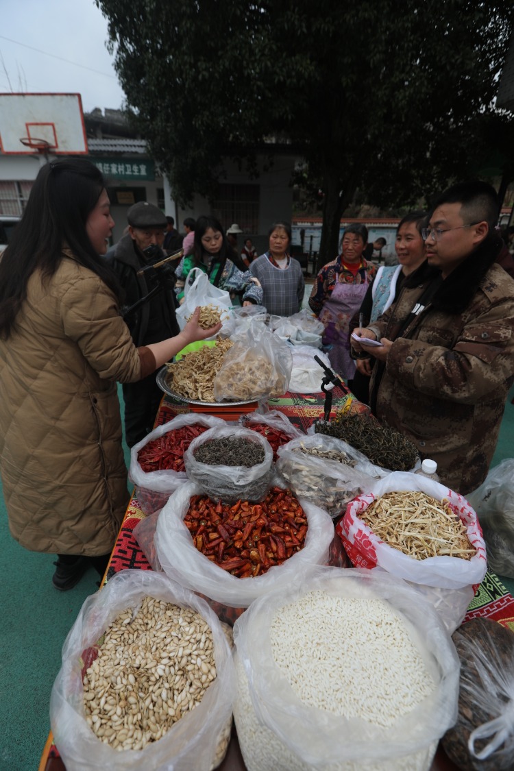 喧鬧的現(xiàn)場,一位年過七旬的婆婆擠進(jìn)了人群,“我這有胡豆、南瓜干、紅苕粉些,你們幫我賣了嘛。”