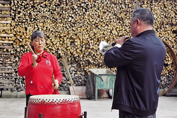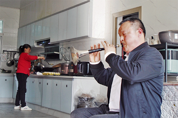 回到家,任建榮繼續(xù)忙碌了起來,清洗完裝豆腐的工具后,就忙著在廚房做飯。如果沒有其他的事情,王洪則在一旁擺弄起自己的業(yè)余愛好——嗩吶,默默地陪伴著。任建榮也學會了打鼓,空閑時,一個打鼓、一個吹嗩吶,兩人卻能恰到好處地配合起來完成一首曲子。