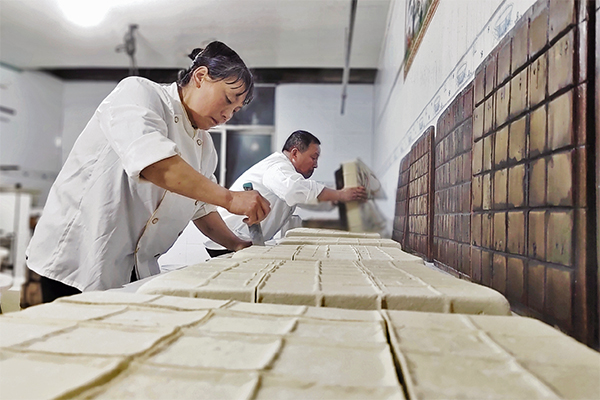 結婚二十多年來,他們已經(jīng)習慣了彼此。盡管制作豆腐工序繁瑣,但夫妻倆卻配合得十分默契,經(jīng)過近五個小時勞作,一顆顆金燦燦的黃豆變成了一塊塊白白嫩嫩的豆腐。
