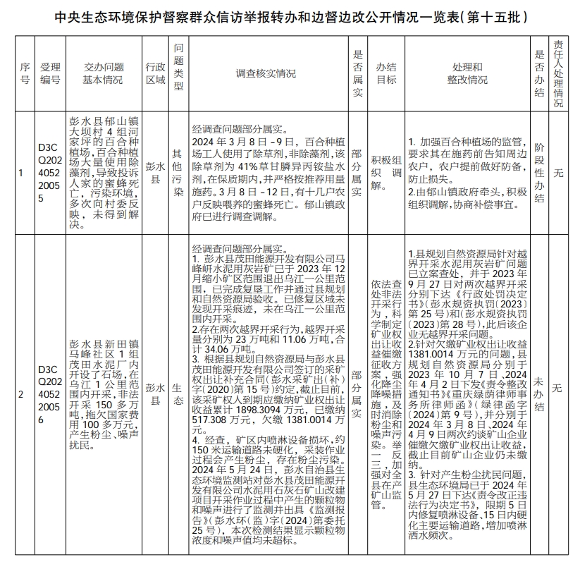 截至2024年6月2日,對中央第六生態(tài)環(huán)境保護(hù)督察組向重慶市移交的第十五批群眾信訪舉報件,涉及彭水自治縣2件(已辦結(jié)1件,正在辦理1件),已按要求調(diào)查處理,現(xiàn)向社會公開。
