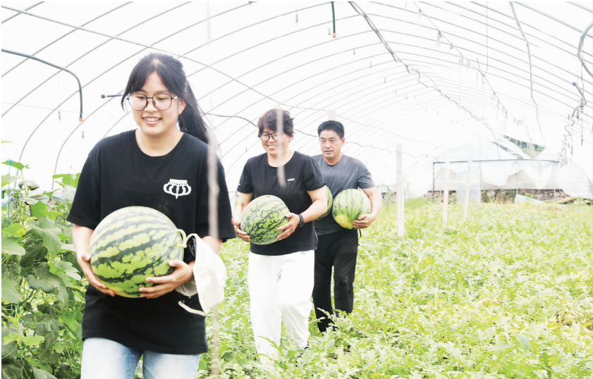 走進(jìn)瓜棚里,一個(gè)個(gè)油亮亮、圓滾滾的西瓜披著翠綠色的外衣躲在茂盛的瓜藤下,散發(fā)獨(dú)特的香甜氣息,若隱若現(xiàn)煞是喜人。李明琴手法嫻熟,快速而準(zhǔn)確地采摘下一個(gè)個(gè)熟透的西瓜,臉上洋溢著豐收的喜悅。