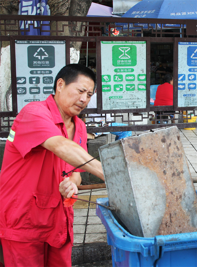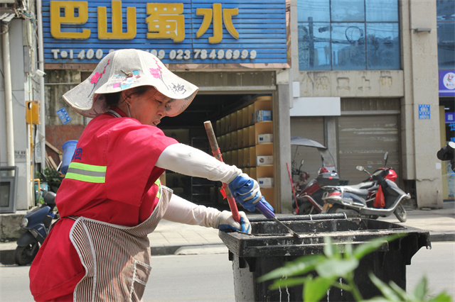 “垃圾點(diǎn)位地面容易淤積污垢、油漬,高溫天氣垃圾發(fā)酵后點(diǎn)位周邊氣味難聞,每天早上垃圾清運(yùn)完后,我們就會(huì)對(duì)各垃圾點(diǎn)位路面淤積的油漬污垢、垃圾桶進(jìn)行徹底洗刷,去除臟污?!标惷骰ㄕf(shuō)。