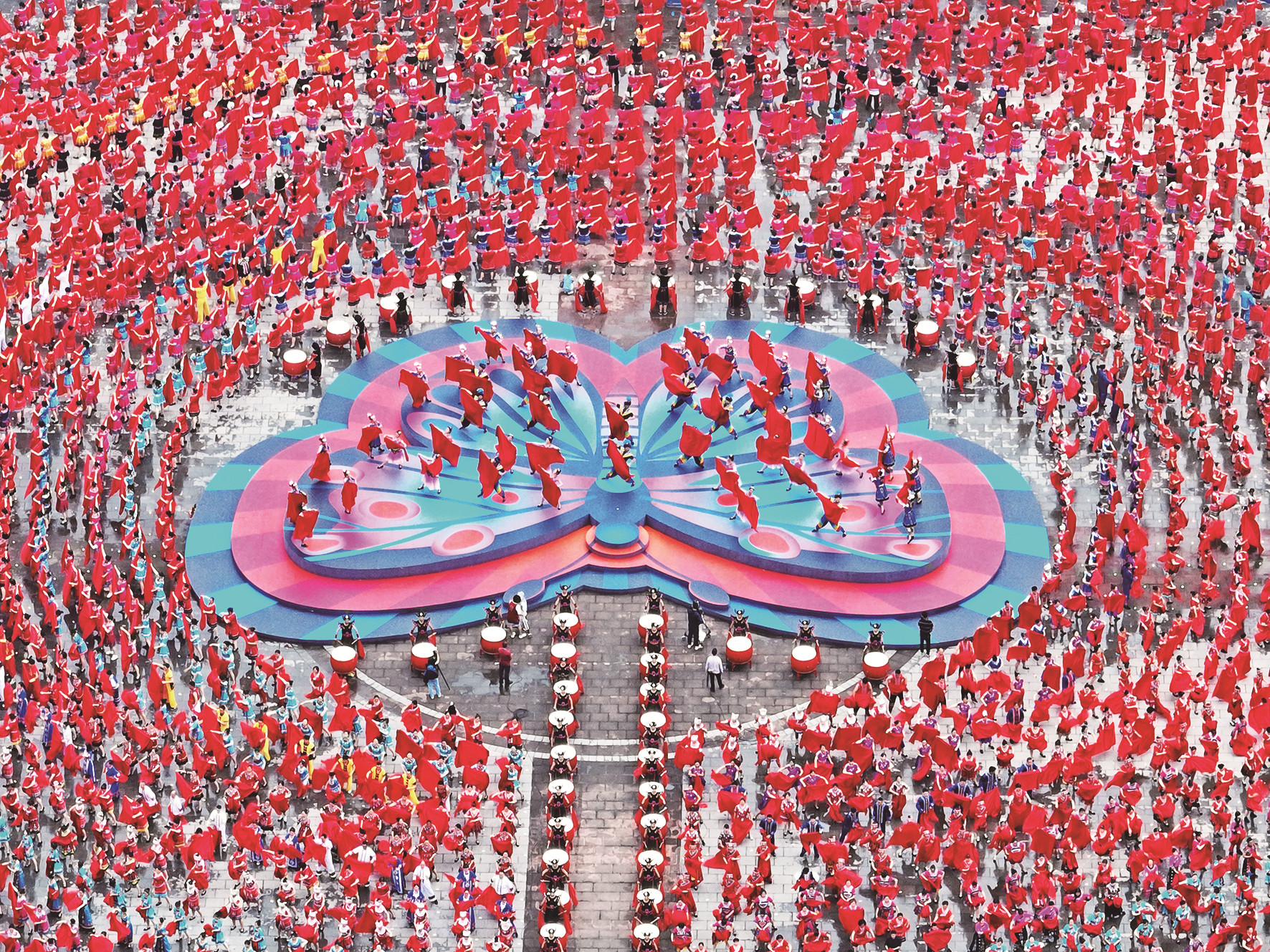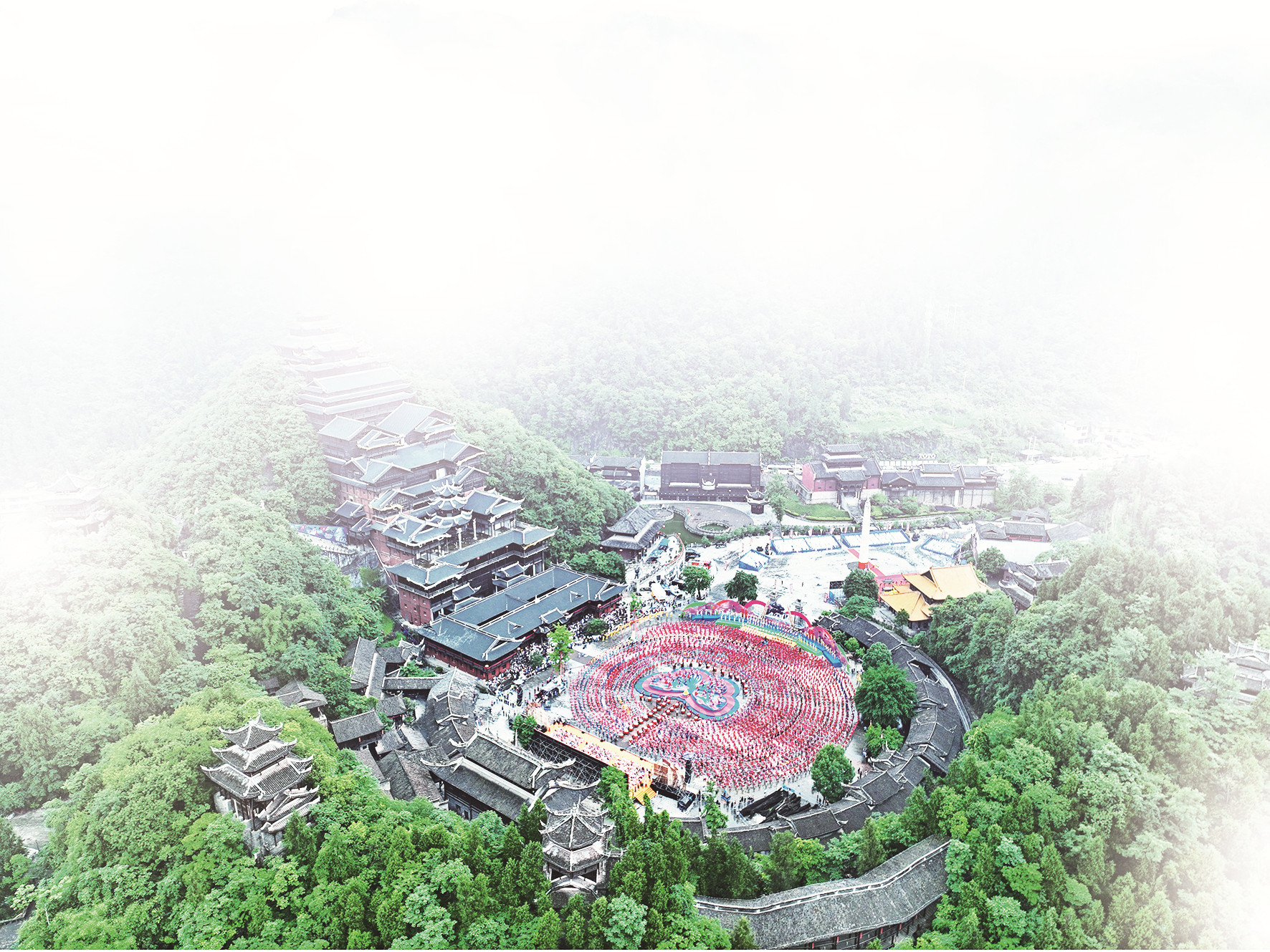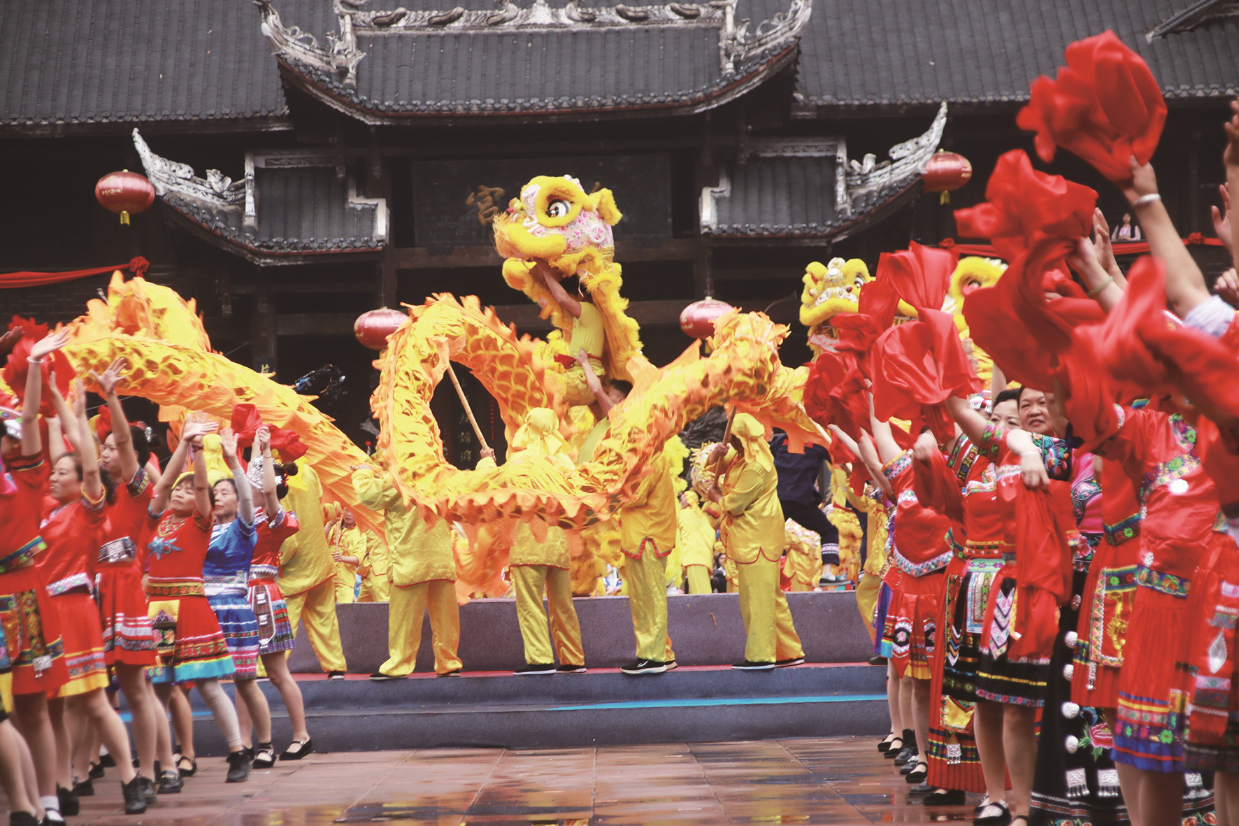 九黎廣場的大型蝴蝶舞臺、后側巨大的石磨巖造景、高高低低的山巒造景……匯聚成一道道最美中國紅。