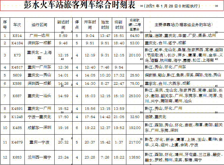 1月27日,記者從彭水火車站獲悉,1月28日起,彭水火車站實行春運(yùn)列車運(yùn)行圖,春運(yùn)期間(1月28日至3月8日)每天共有12趟旅客列車經(jīng)停彭水火車站。